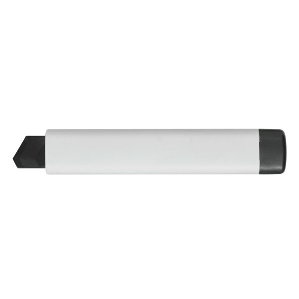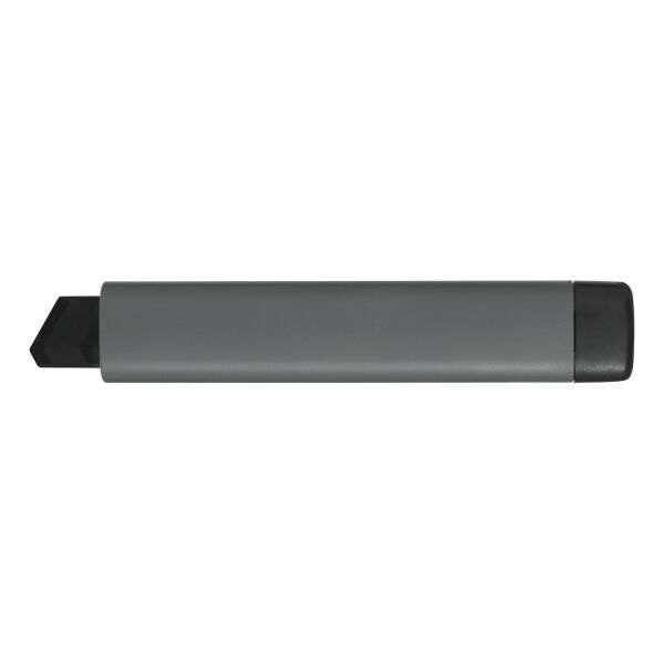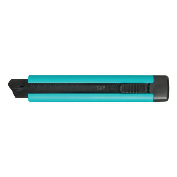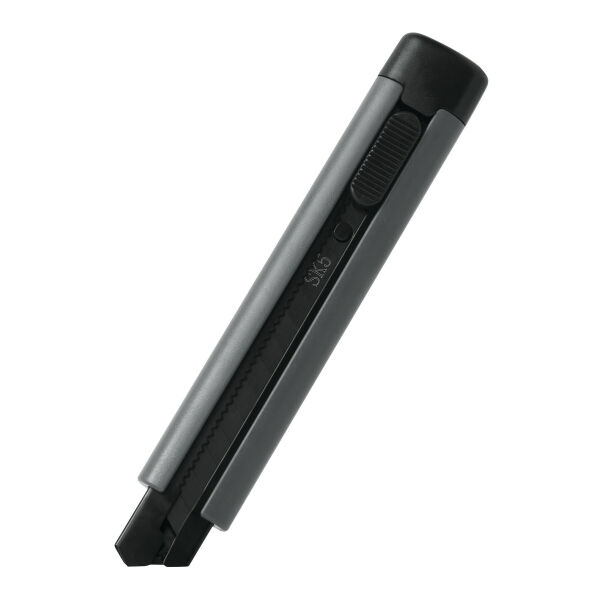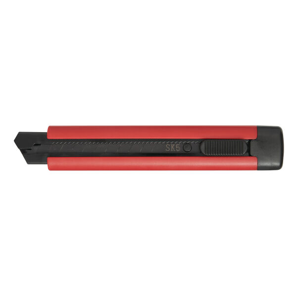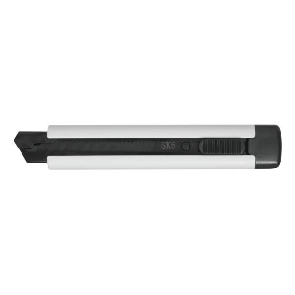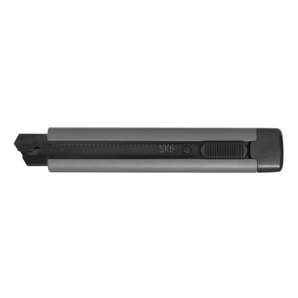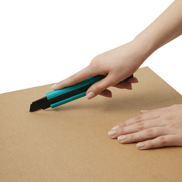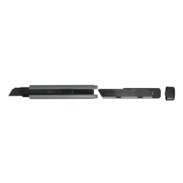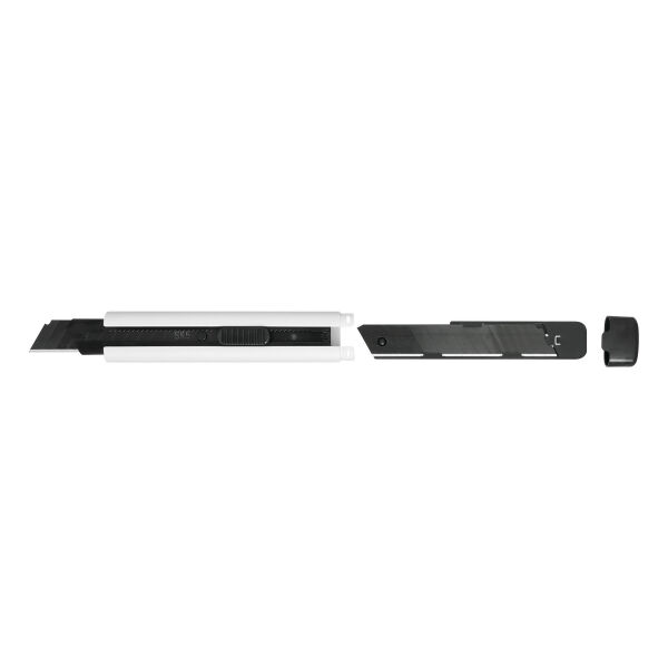 Afbreekmes RELIABLE: met beweegbaar, zwart afbreekmes van 18 mm (10 snijsegmenten en reservemes), mechanisme met schuifknop en automatische stop, kunststof behuizing, mesgeleiding van staal, voor lichte tot zware snijklussen, verpakt in een doos.
