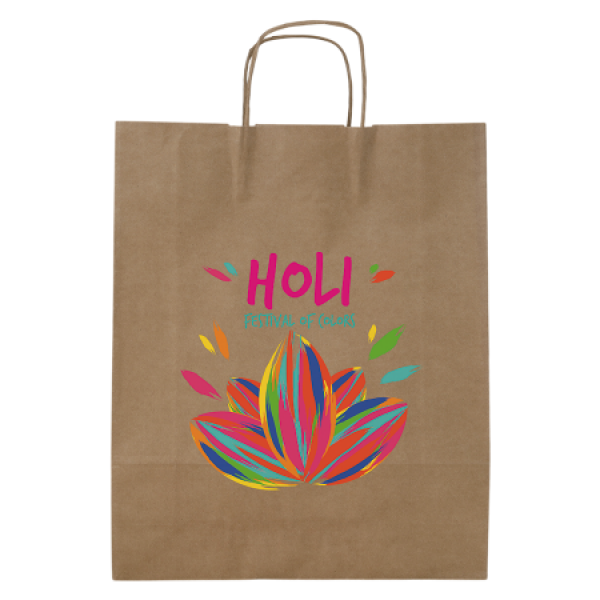 Papieren tas in wit en ecru, gemaakt van FSC-gecertificeerd papier (100 gr/m²) en geproduceerd in Europa. De tas (320x420x110 mm) heeft gedraaide hengsels in de kleur van de tas. Let op: volvlakdruk niet mogelijk.